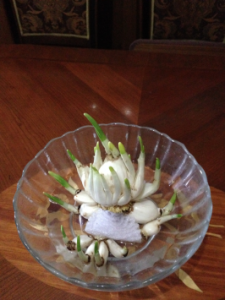 12月4日一平米沙龙水仙雕刻培训后,手捧优质水仙头(种子),兴致勃勃地回家了。尽管外表被灰色的泥土色的薄皮包裹着,露出八颗浅绿色的嫩芽,貌不惊人,但内心还是充满了期望与等待,期盼喜从天降的那一刻。